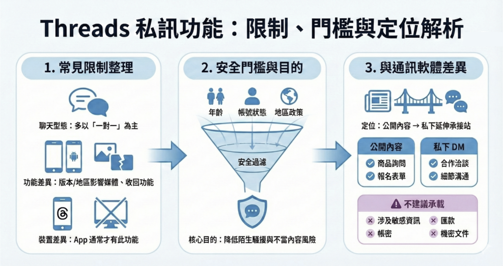先把概念講清楚,你後面看功能操作與限制會更好懂。因為很多人卡關,其實不懂 Threads 私訊的「設計目的」。