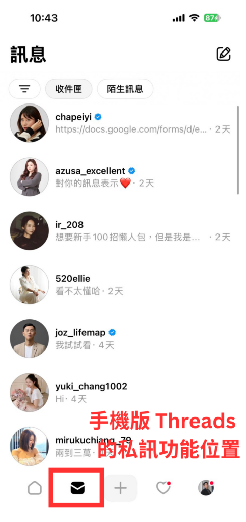 1. 打開 Threads → 點下方「信封」進入收件匣。